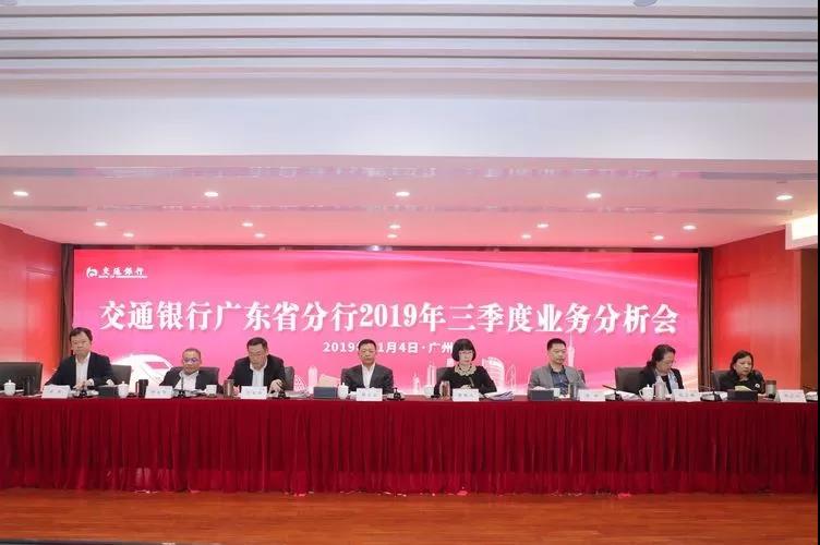 2019年11月4日,交通银行广东省分行召开2019年三季度业务分析会。党委书记、行长周宝志以《决胜“三连冠” 强势“开门红” 奋力开创广东省分行高质量发展新局面》为题,作报告讲话;党委委员、副行长郑婉庆主持会议并部署全面风险管理工作;党委委员、副行长方金水、朱斌、钟达坚、付之琳、黄海分别部署分管板块工作;资深专家(省分行正职级)谭志清出席会议。