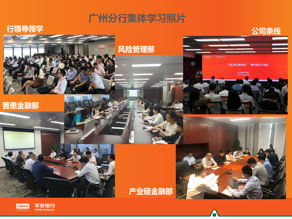 正风肃纪活动开展以来,平安银行广州分行多层面、多渠道开展了系列学习教育活动:一是要求全行各单位、各条线组织开展集体学习,并向分行上报学习情况报告,各层面集体学习已滚动覆盖分行两千多人次;二是向全行推送“正风肃纪”知鸟考试,覆盖全员,100分方可通过;三是每周通过邮件、电视视频向全行推送“正风肃纪”宣导材料,截至目前已推送三期,内容分别为正风肃纪行动的背景、要求和重点关注问题,分行举报渠道公示以及员工利益冲突管理要求。