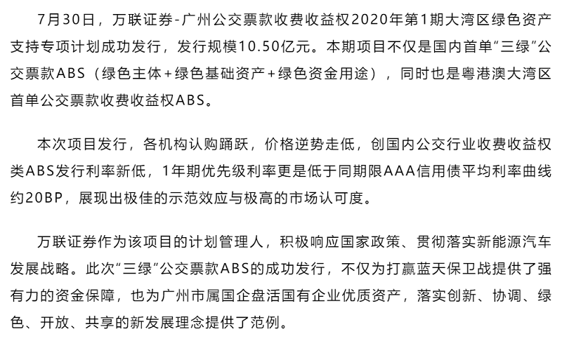 全国首单三绿公交票款收费收益权资产支持证券(ABS)成功发行——万联证券