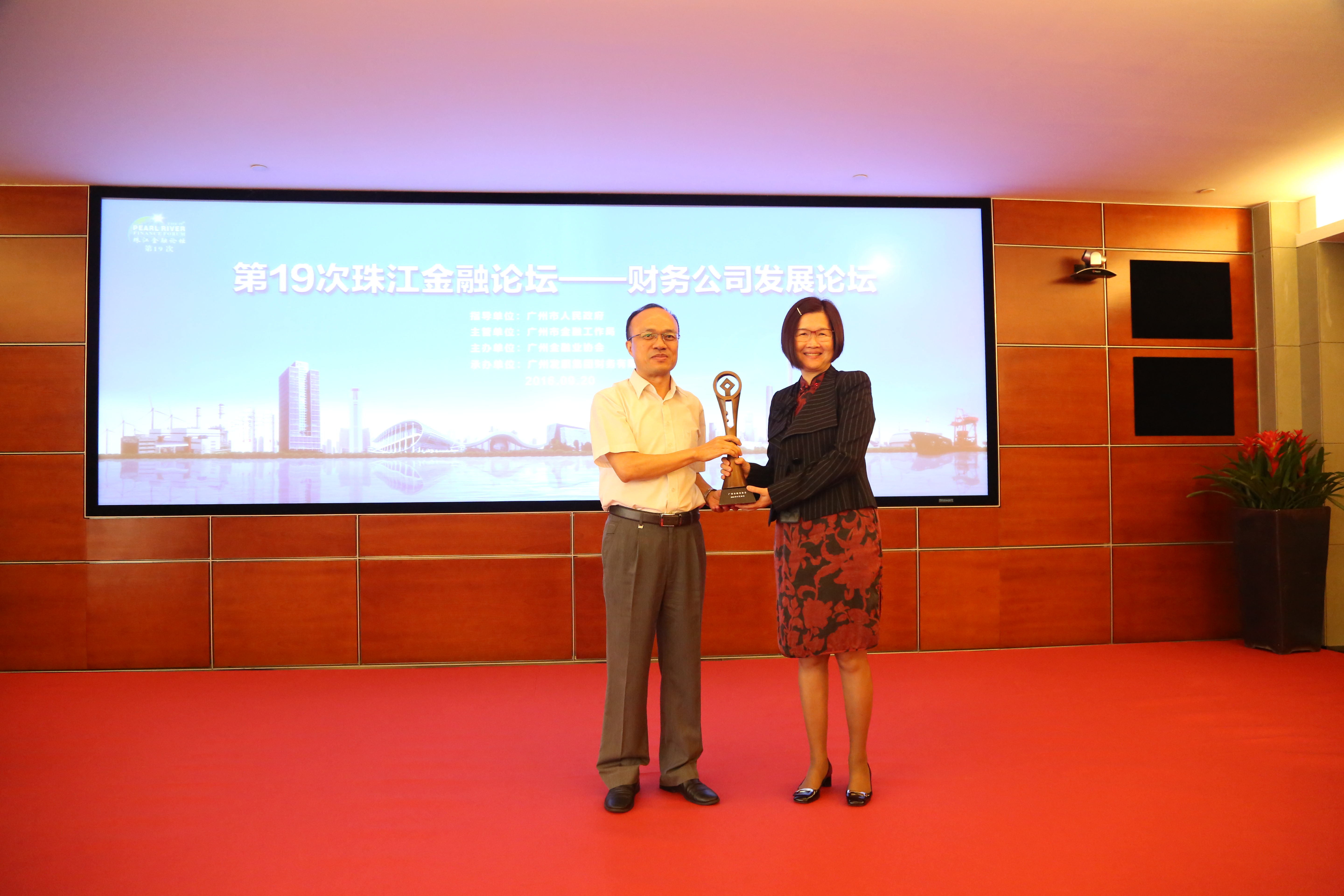 论坛现场还对“财务公司发展论坛”征文活动的获奖论文作者进行了表彰,伍竹林董事长为征文获奖者颁发获奖证书。邱亿通局长向论坛承办方颁发第19次珠江金融论坛纪念杯。