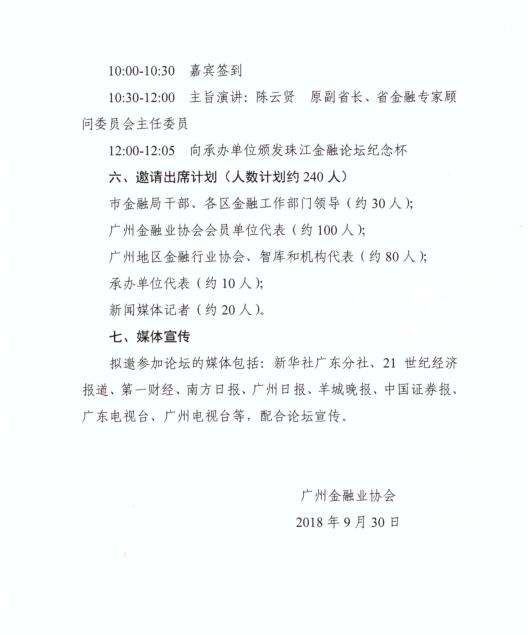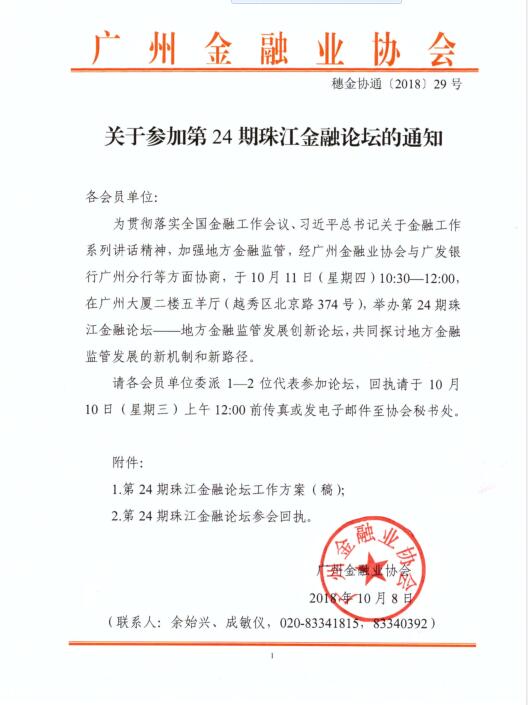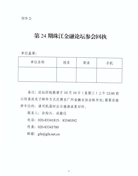 备注:论坛回执敬请于10月10日(星期三)上午12:00前以传真或电子邮件方式反馈至广州金融业协会秘书处;需要安排停车位的,请司机届时出示邀请函复印件。